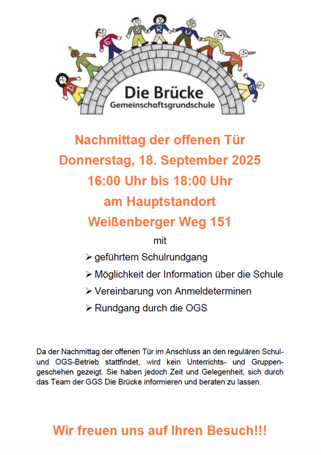 Die Gemeinschaftsgrundschule DIE BRÜCKE trägt ihren Namen seit 1997. Wir verstehen uns als "Brücke" zwischen allen Menschen. die am Schulleben teilhaben. Dieser Gedanke der Verbindung von Menschen unterschiedlichster Herkunft, Konfession und Leistungsfähigkeit findet sich in der pädagogischen Konzeption der Schule wieder.